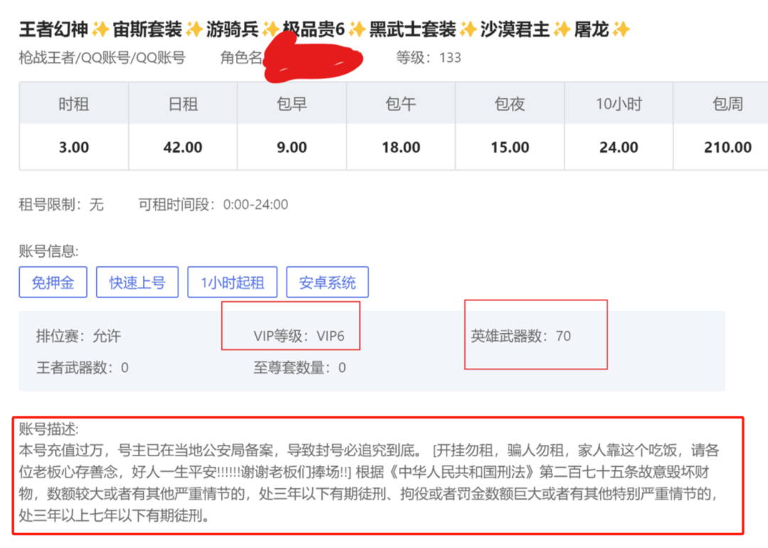 另外,这个项目也是有一定的风险的,账号买来以后,QQ被冻结、租客开挂、账号被封这些问题都有可能碰到。